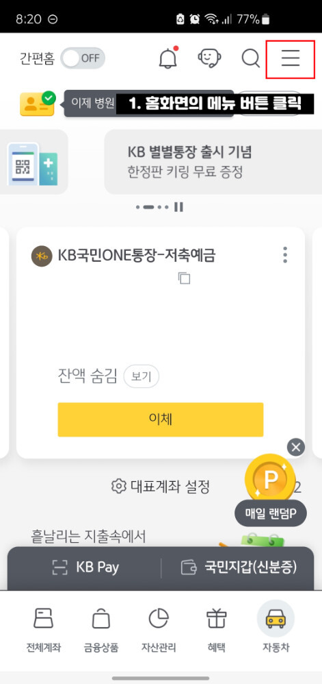 스마트폰에서 KB스타뱅킹 앱을 실행한 뒤 로그인합니다. 로그인이 완료되면 화면에 있는 전체 메뉴 버튼을 선택해 주세요.