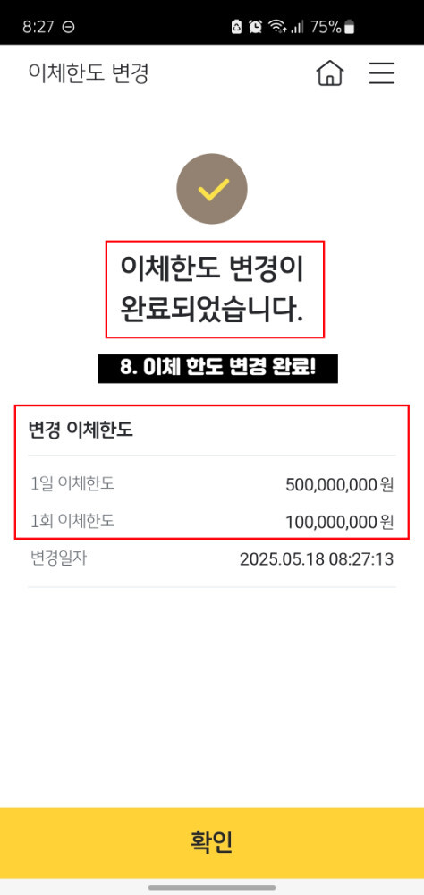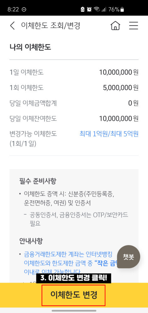 현재 적용 중인 1일 한도와 1회 한도를 확인한 뒤, 변경 버튼을 선택합니다.