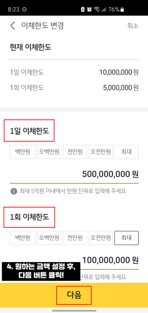 입력한 이체 한도 내용을 다시 한번 확인한 뒤 다음 버튼을 누릅니다.