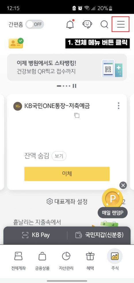 KB스타뱅킹 앱을 실행한 뒤 로그인합니다. 홈 화면을 보면 오른쪽 상단에 전체 메뉴로 이동할 수 있는 버튼이 보이는데요. 이 버튼을 눌러 전체 메뉴 화면으로 이동합니다. 이곳에서 이체와 관련된 다양한 금융 기능을 확인하실 수 있습니다.