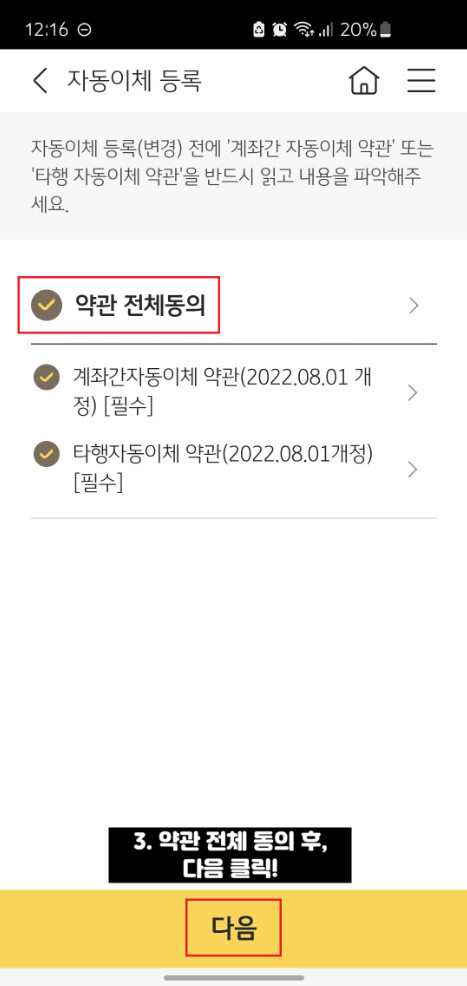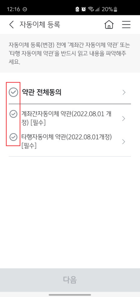 자동이체 등록을 처음 진행하시는 경우, 관련 약관에 대한 동의 절차가 나타납니다. 약관 내용을 간단히 확인한 뒤 전체 동의를 선택하고 다음 단계로 이동하시면 됩니다.