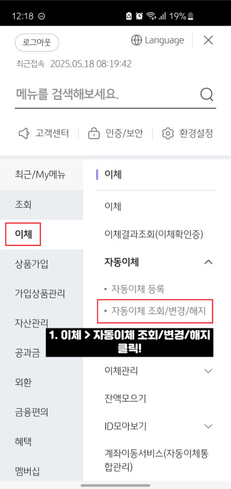 1. 자동이체 조회·변경·해지 메뉴 이동
