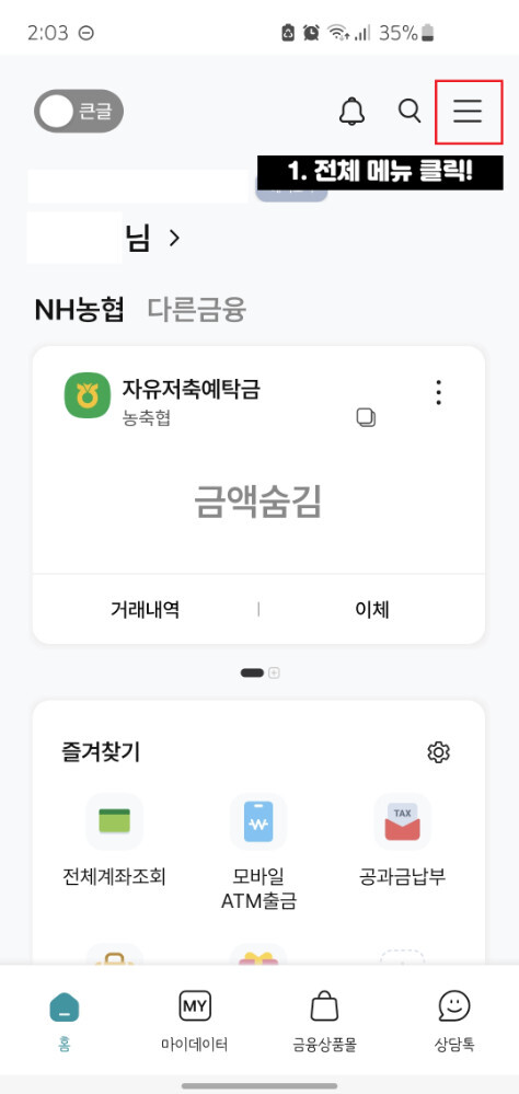 가장 먼저 본인 핸드폰에 설치된 NH스마트뱅킹 앱을 열어주세요. 메인 화면 오른쪽 위에 있는 가로 세 줄 모양의 전체 메뉴 버튼을 터치합니다.