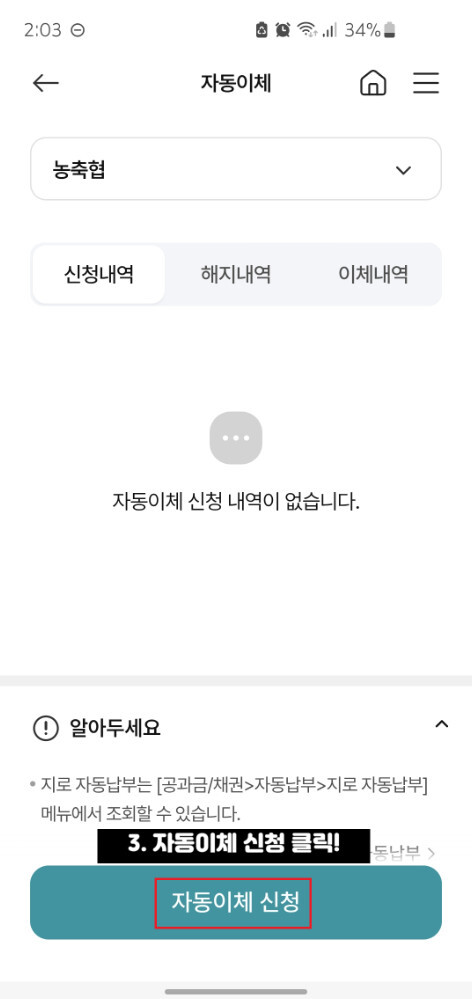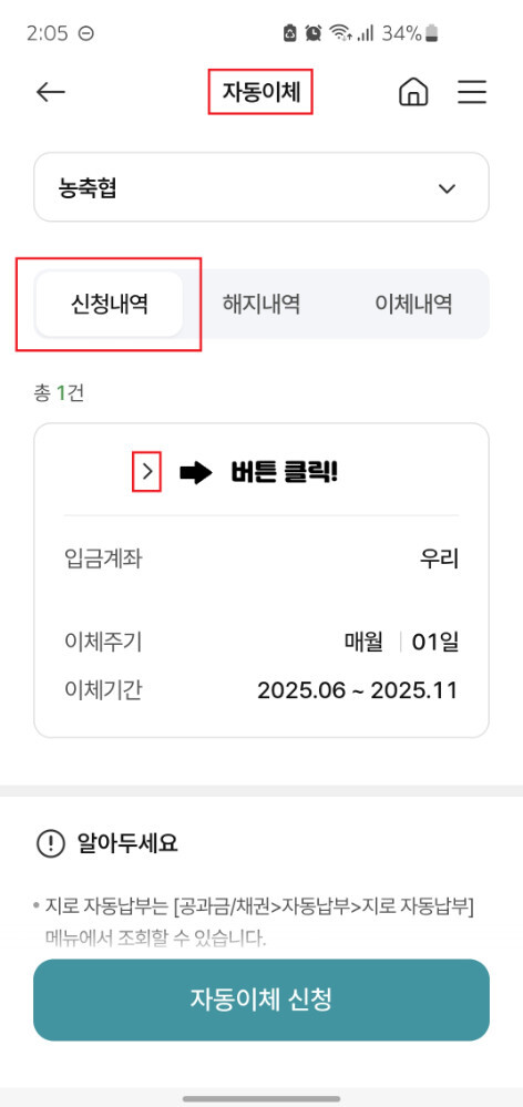 화면 하단에 보이는 ‘자동이체 신청’ 메뉴를 눌러 본격적인 세부 정보 입력 단계로 넘어갑니다.