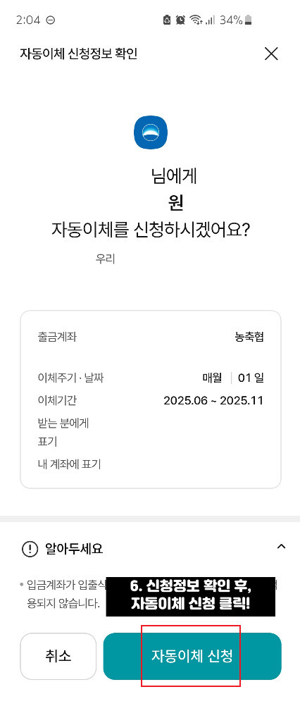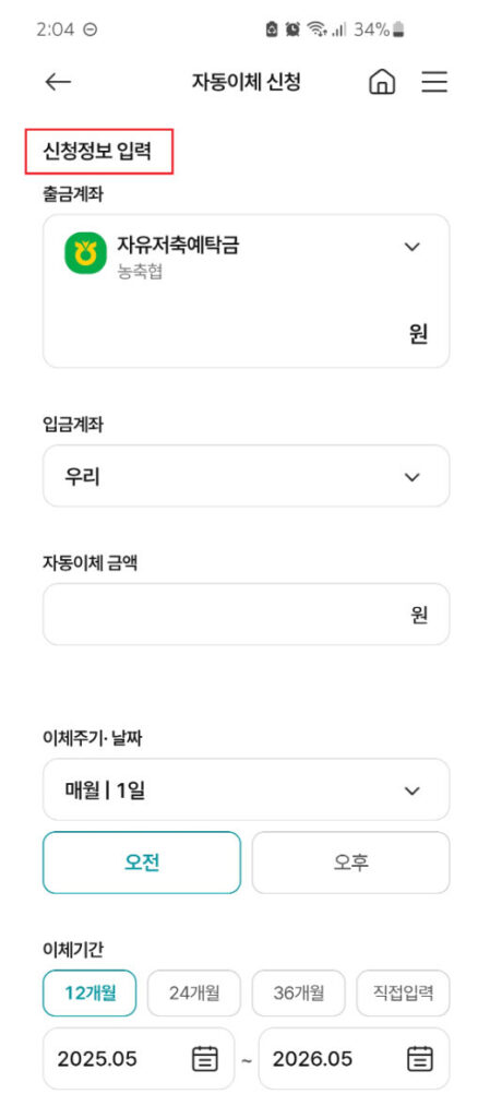 돈을 받을 계좌 정보와 보낼 액수, 그리고 이체가 실행될 날짜와 기간을 정확하게 기입합니다. 농협 자동이체 신청 방법 중 이 부분이 가장 중요하니 오타가 없는지 꼭 확인하고 다음을 눌러주세요.