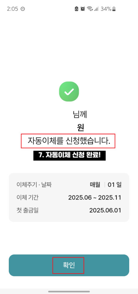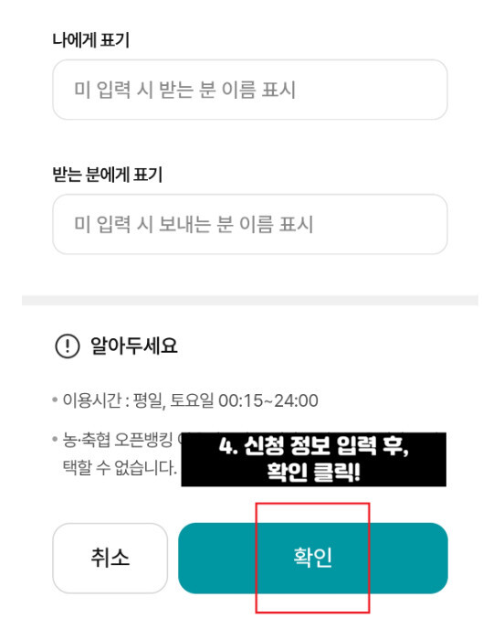 본인이 입력한 입금 계좌와 금액 등이 맞는지 다시 한번 꼼꼼하게 살핀 뒤, 마지막으로 신청 확정 버튼을 클릭합니다.