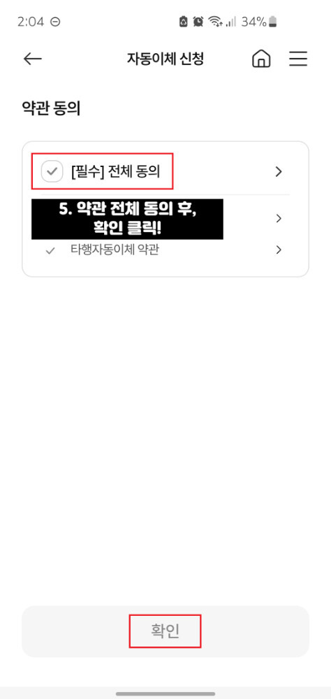 금융 서비스 이용에 필수적인 약관들이 나오면 내용을 훑어보신 후 전체 동의를 체크하고 확인 버튼을 누릅니다.