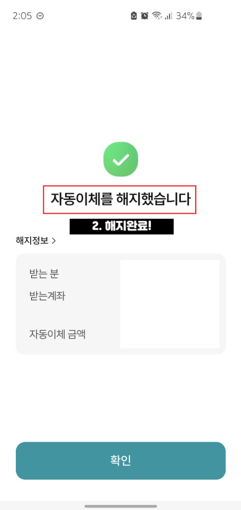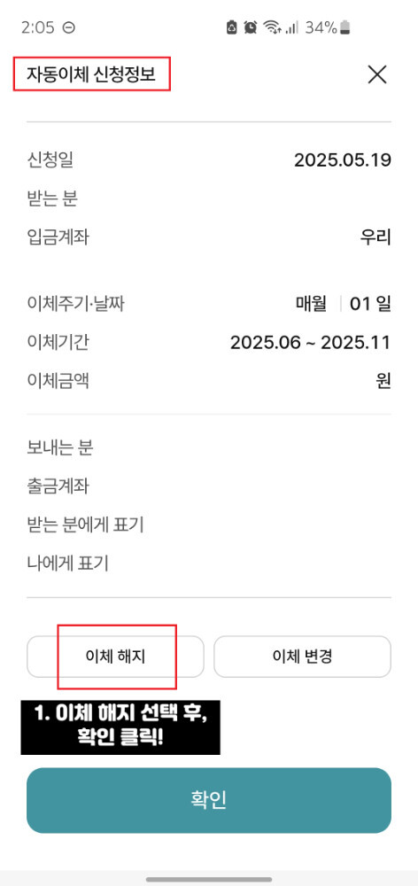2) 현재 등록된 목록 중에서 해지를 원하는 항목 옆의 화살표 버튼을 누른 뒤, 상세 정보 하단의 ‘이체 해지’를 선택하고 확인을 누르면 즉시 취소됩니다.