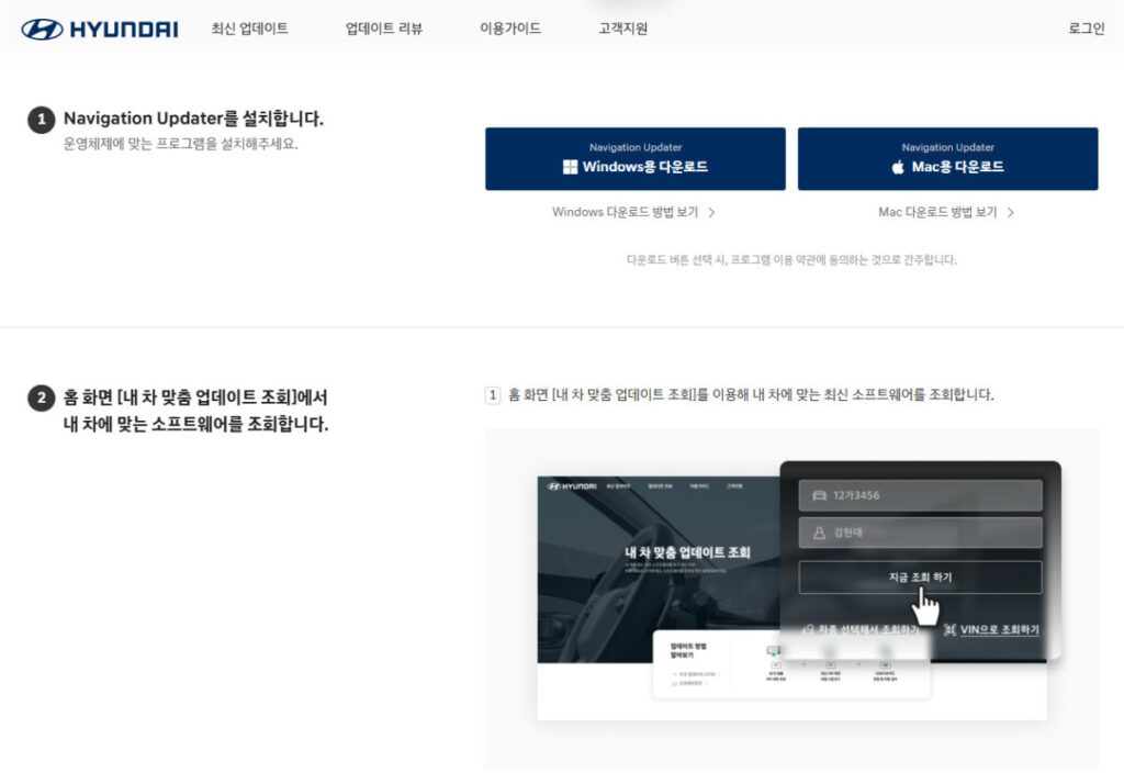 설치 후에는 회원 로그인을 하지 않아도 차량 정보를 입력해 업데이트를 진행할 수 있어 부담이 적습니다. 프로그램 실행 후 차량 모델과 연식을 선택하면 해당 차량에 맞는 최신 지도와 소프트웨어가 자동으로 조회됩니다.