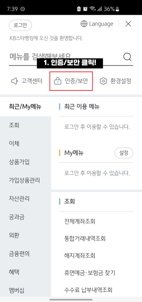 1. KB스타뱅킹 앱 실행 후 인증 메뉴 이동