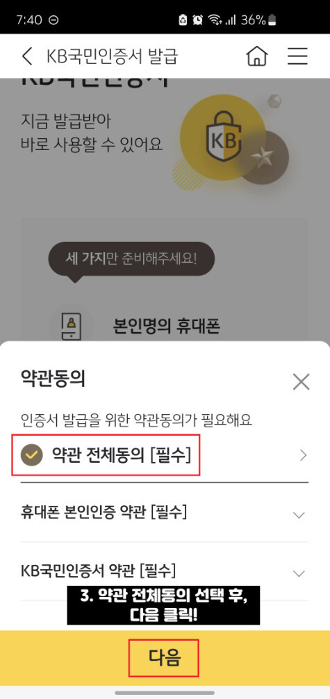 인증서 발급을 위해 필요한 필수 약관 동의 단계가 나옵니다. 내용이 길게 느껴질 수 있지만, 전체 동의를 선택한 뒤 다음 단계로 넘어가시면 됩니다.