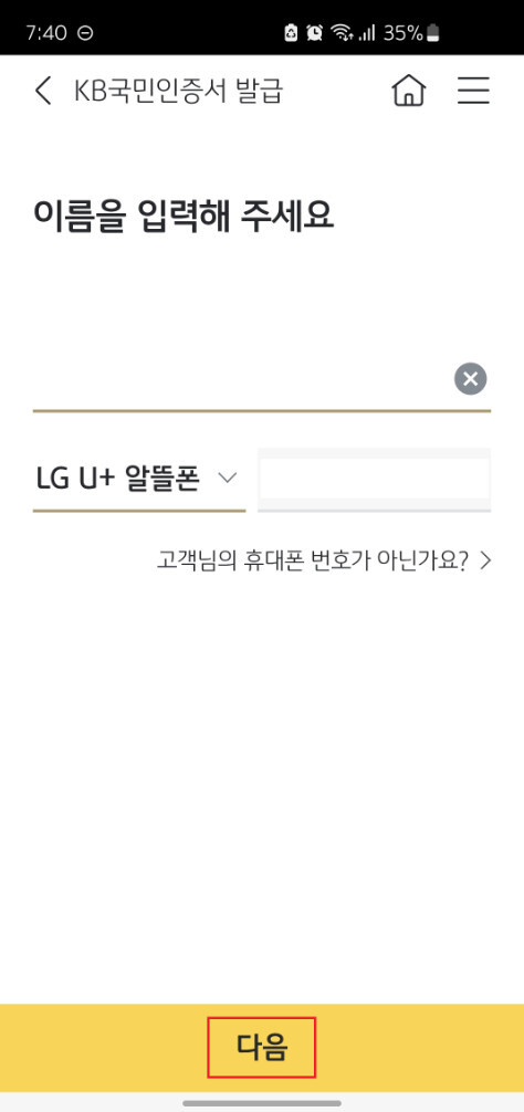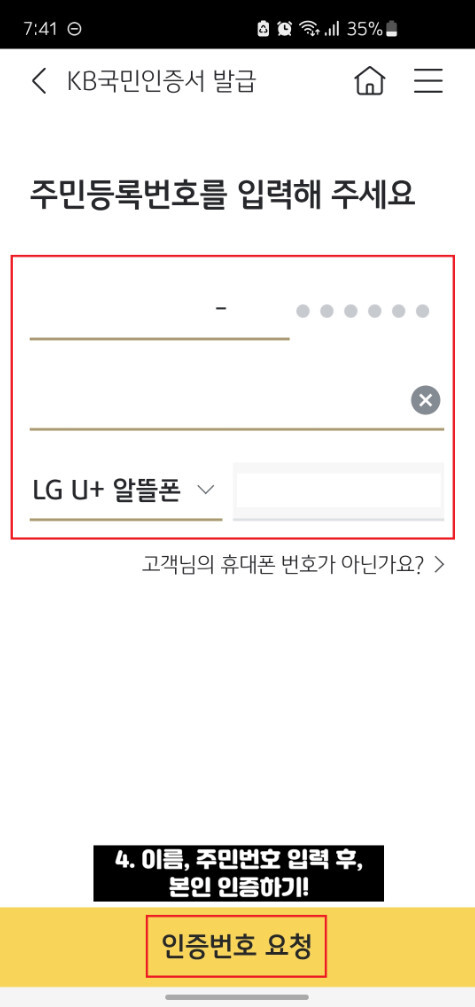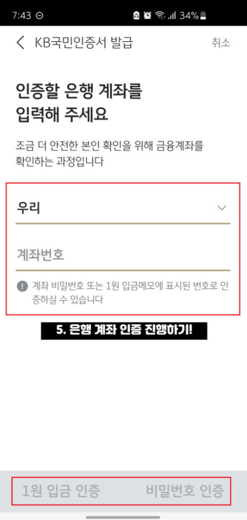 보안을 강화하기 위한 추가 인증 단계로, 본인 명의의 국민은행 계좌번호와 계좌 비밀번호를 입력하게 됩니다. 이 절차를 통해 인증서 발급의 안전성을 한 번 더 확인하게 됩니다.